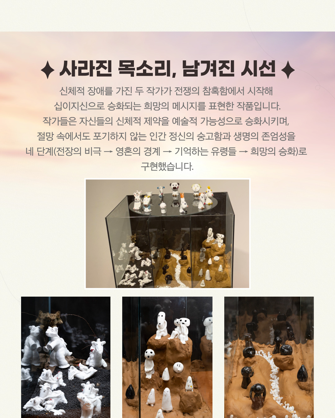 Ç⸲ÀÛ¾÷Àå¿¡¼­´Â "»ç¶óÁø ¸ñ¼Ò¸®, ³²°ÜÁø ½Ã¼±"À̶ó´Â ÁÖÁ¦·Î Ưº°ÇÑ ÀÛǰÀ» ¼±º¸¿´½À´Ï´Ù.